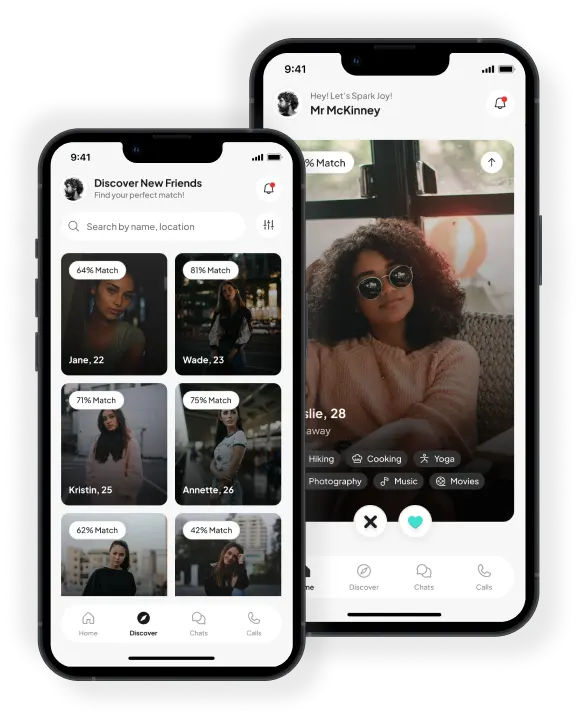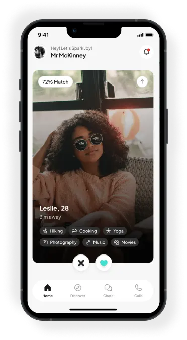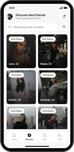 Browse profiles with match percentages, and search for people by name or location. Discover connections that align with your values and are close to you.